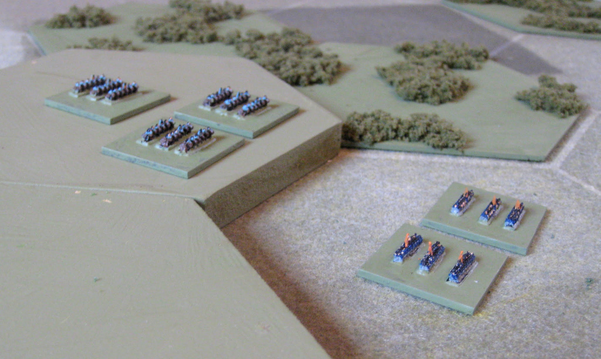 My game consisted of a meeting engagement, with an Allied corps, consisting of three infantry divisions, a cavalry division and an artillery brigade. The French force was roughly the same size. As per the book, the Allies pushed forwards to sieze the village of Twee Heuvels and the ridges on either flank, with the Dutch division taking the allied right hand ridge and the cavalry on the left. The third British division is moving up in reserve.
